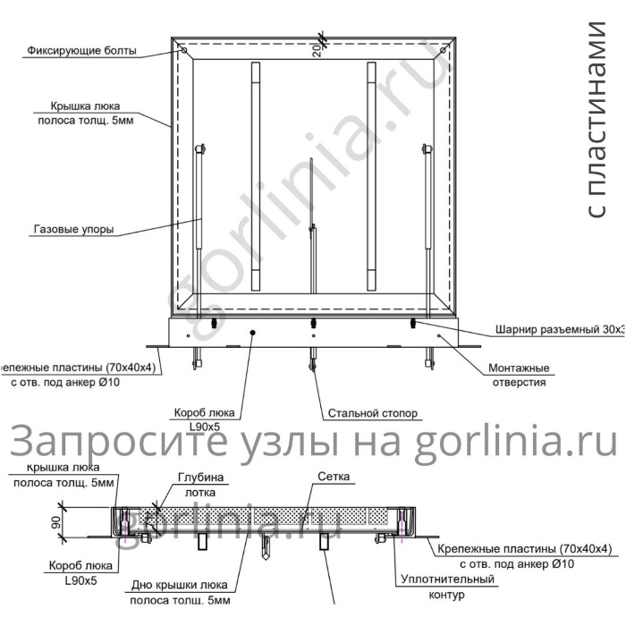 Модель с внешними разъемными шарнирами на болтах для возможности покрытия цинком. Механизм с усиленными газлифтами 2000Н, стопорным устройством автоматической фиксации в открытом положении. Запорное устройство на винтах. Две съемные рукоятки по углам для поднятия крышки. Ленточное эластичное уплотнение по притвору.