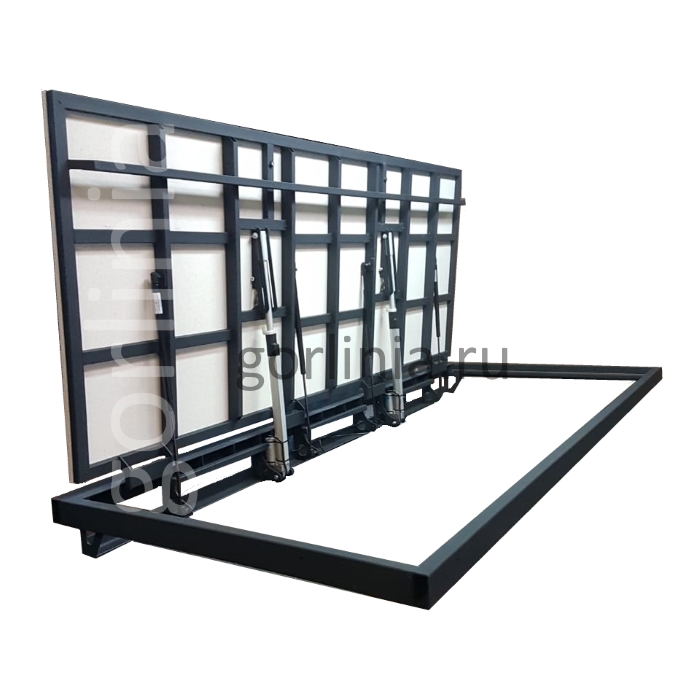 Точечный вылет кронштейнов крепления электроподъемника к раме относительно опорных поверхностей составляет 48 мм в зависимости от мощности устройства.Ходовая часть работает на скрытых под полкой сварных угловых петлях с одной осью вращения.