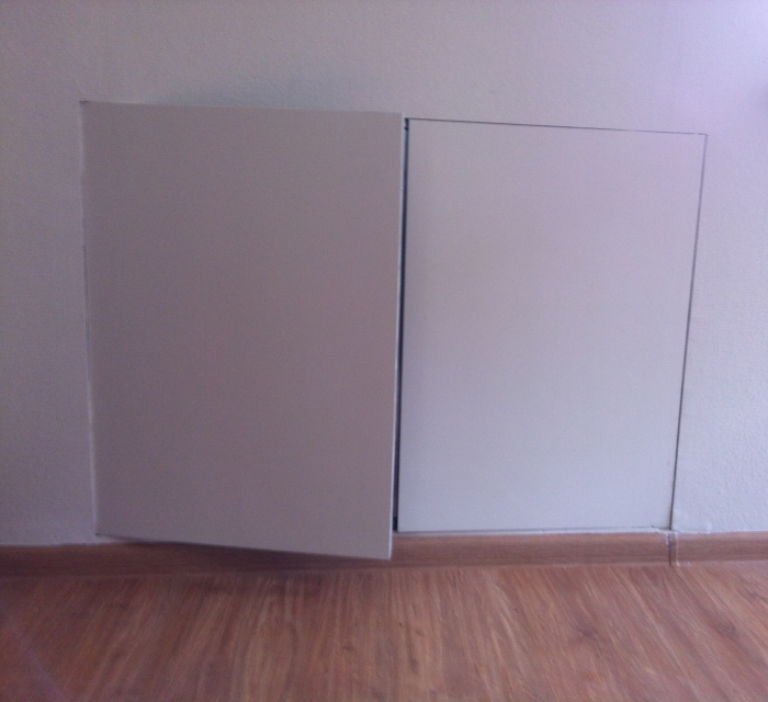 Нажимные дверцы распахиваются на несъемных петлях с одной осью вращения, дополнительно фиксируется в коробке через съемную перемычку по центру