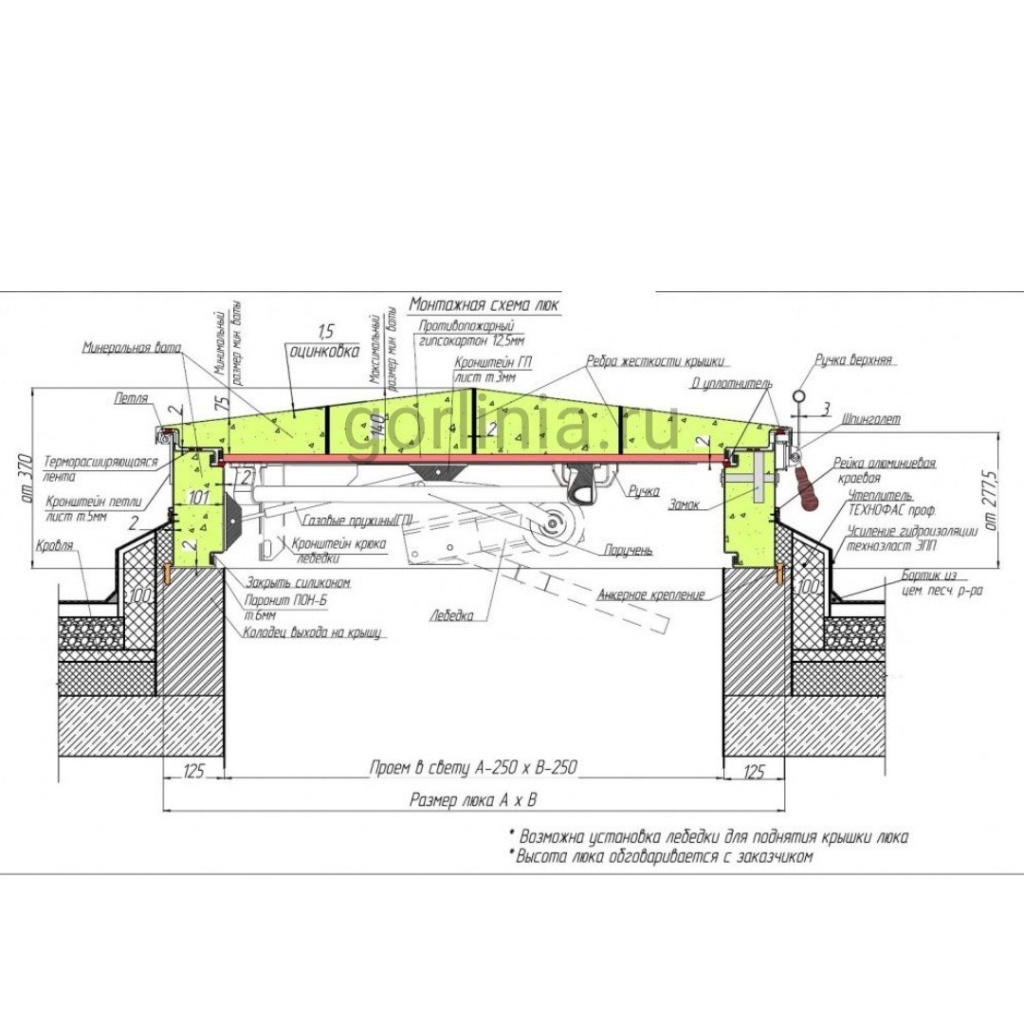 Рекомендуем заказать дополнительную лебедку для облегчения подъема дверцы 1,8х1 с технического этажа после снегопада в зимний период.