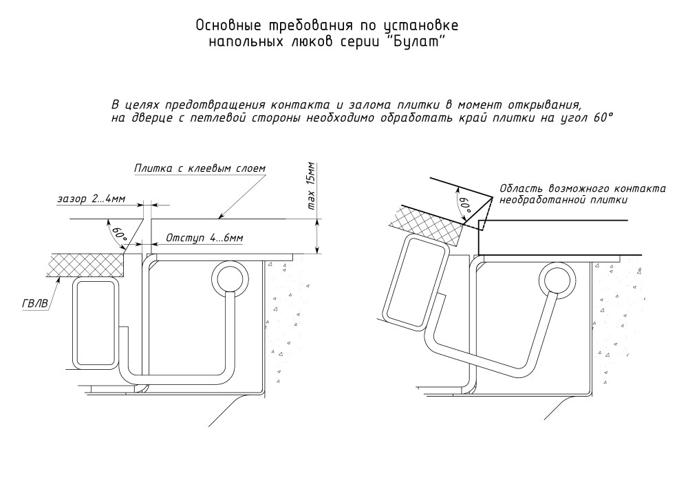 Рама с наличником для установки на напольное отверстие с креплением саморезами по контуру. Крышка ходит на петлях амортизаторами.
