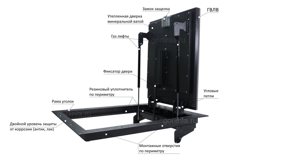 Люк сварен в раме из равнополочного уголка горячего проката. Внешние размеры конструкции составляют 715х1115 мм. Установка производится методом погружения в напольный проем 600*1000 мм. Петли расположены по стороне 1000 мм.